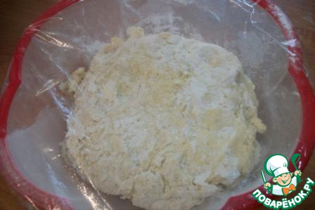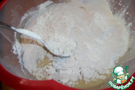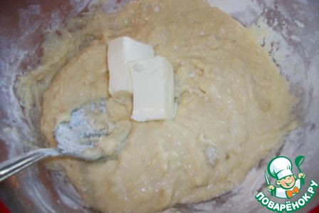 Все продукты смешиваем и добавим к ним сливочное масло комнатной температуры и оставшуюся муку.