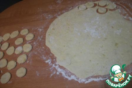 ну а здесь вообще всё проще простого. Раскатываем пласт толщиной 0,7-1 см и вырезаем кружки. Осталось только поджарить наши пышки.