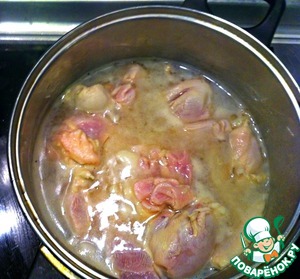 • Куриное мясо, без костей и шкурок, отвариваем в вине 20мин