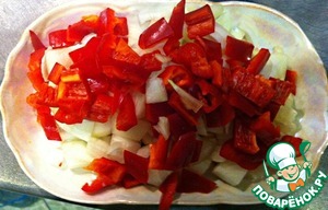 • Стебли сельдерея, лук и перец нарезаем одинаковыми кубиками
