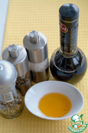 Приготовить классическую заправку. Смешать оливковое масло с бальзамическим уксусом. Посолить, поперчить. (Я добавляю чайную ложку качественного соевого соуса, тогда солить не нужно)