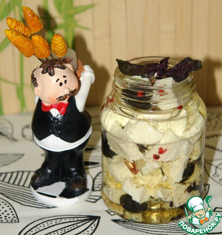 Чеснок раздавить. Выкладывать сыр слоями в банку, пересыпая каждый слой сушеным и свежим базиликом и розмарином. В каждый слой сыра обязательно добавить оливки и вяленые томаты.