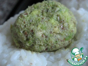 • 8. Сформировать из получившейся смеси небольшие шарики и, так же, уложить их на рисовую подушку.