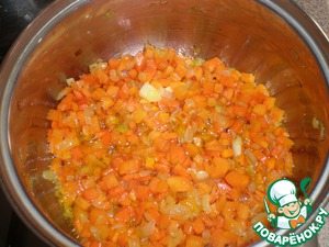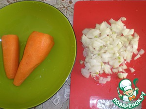 Нарезаем кубиками лук. Обжариваем до золотистого цвета.