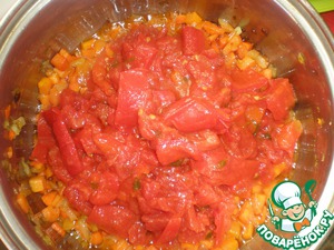 Добавляем нарезанный перец и помидор. Правда, у меня перец маринованный в томатном соку. Тушим минут 5-7. Солим и добавляем приправу, укроп и петрушку.