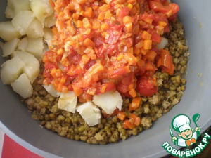 Добавим овощи и картошку к фасоли. Если вам кажется, что слишком густой соус, добавьте немного горячей воды.