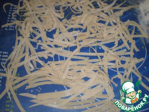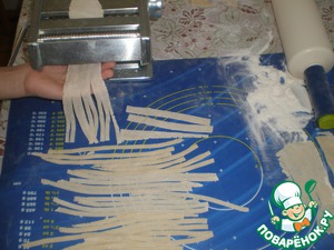 Дальше из пластин нарезаем лапшу такой ширины и длины, какая вам больше нравится. У меня, правда, есть небольшая помощница - машинка лапшерезка. Моя мама ее не признает и всегда нарезает вручную.