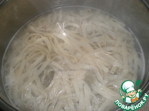 Порциями отвариваем лапшу в кипящей соленой воде минуты 2-3. Каждую порцию откидываем на дуршлаг и сбрызгиваем маслом.