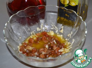 Для заправки взбейте уксус с маслом. Добавьте измельченный чеснок и изюм.