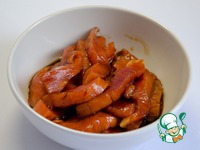 Семгу нарезаем полосочками и заливаем соусом Унаги (это сладкий соус, которым приправляют угорь в японской кухне). Если такового нет в арсенале - делаем сами легко и просто.
