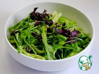Зелень промываем, сушим. Салат рвем на крупные кусочки, у базилика и рукколы отрываем стебли.