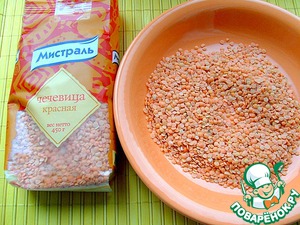 Нам понадобится 1,5 стакана красной чечевицы. Промываем ее...