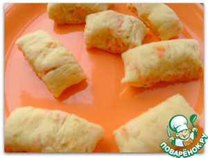 В картофельное тесто выкладываем половину обжаренной моркови и лука, вымешиваем, если есть необходимость, добавляем еще немного муки.