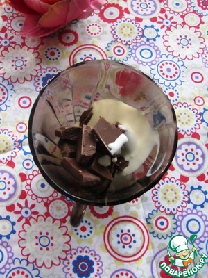 Шоколад ломаем на кусочки и растапливаем с ложкой сливок в микроволновке или на водяной бане. То же самое проделываем с ирисками.