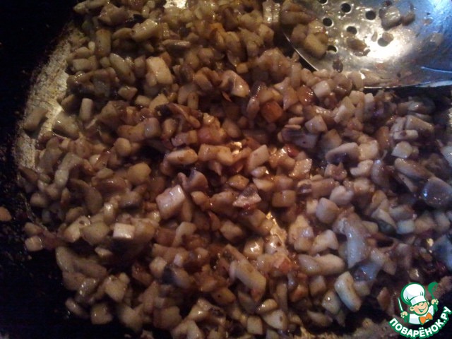 Капута готова, а пока варится картофель, готовим для него заправку. Шампиньоны чистим, режем мелкими кубиками.