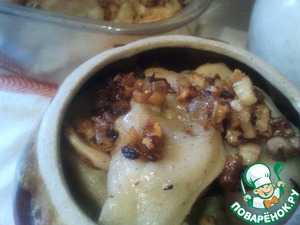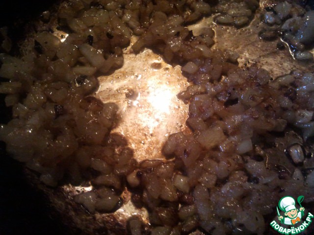 И выкладываем в посудину, пересыпая зажаркой из лука.