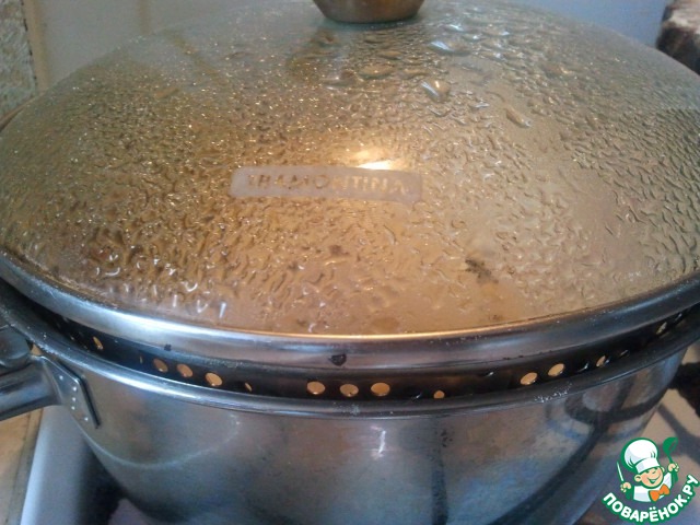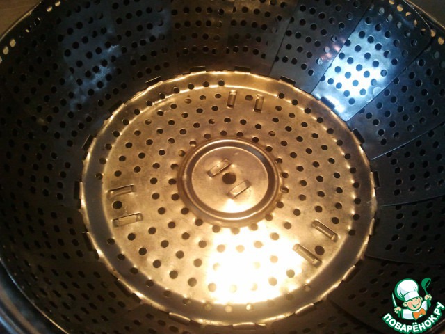 Которую ставлю в кастрюлю с крышкой. Где-то читала, что подсоленая вода кипит при более высокой температура и пар тоже будет горячее. Поэтому наливаю воду примерно на 1 см ниже дна моей решетки, подсаливаю и ставлю закипать.