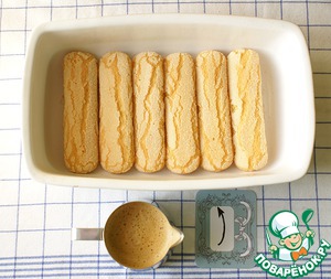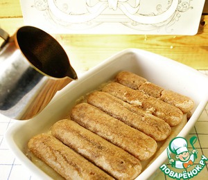 Варим крепкий эспрессо (делаем двойную забивку рожка). Печенье (в нашем случае савоярди или любое постное, какое найдете в магазине) укладываем в форму и пропитываем кофе.