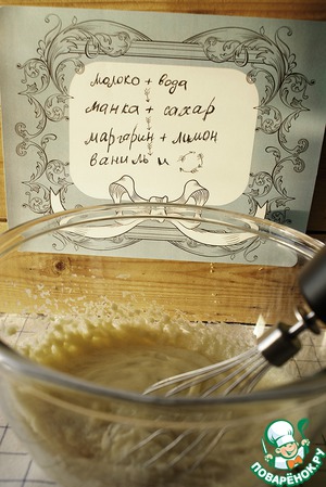 Манку смешиваем с сахаром и в молочко все сыплем потихоньку. Варим густую, сладкую кашу. Пока не остыло! Добавляем маргарин (в магазине внимательно читаем состав на упаковке и берем без животных жиров), лимонный сок и пару капель ванильной эссенции.