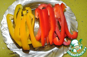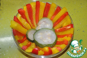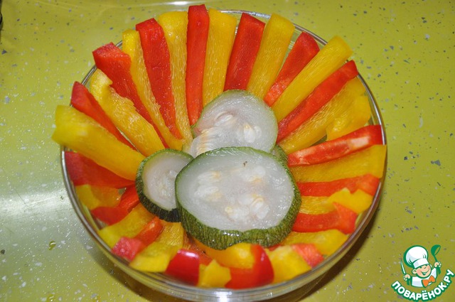 Выкладываем в форму полоски перца попеременно красная-желтая. На дно кладем кружками кабачок.