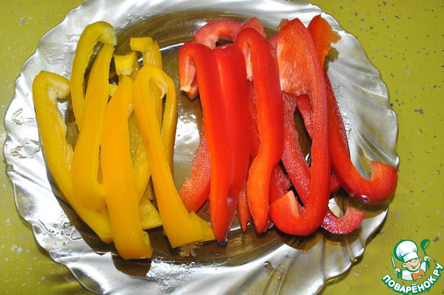 Болгарский перец моем, удаляем сердцевину, режем полосками примерно одинаковой ширины.
