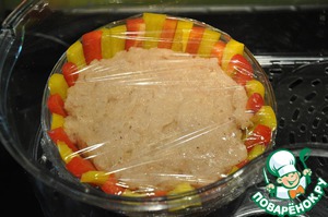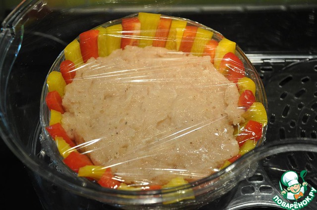 В получившуюся корзинку выкладываем фарш. Накрываем пищевой пленкой и ставим в пароварку на 35 мин
