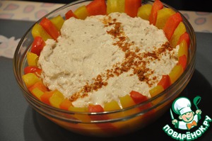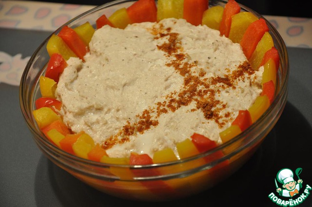 Вынимаем, снимаем пленку, даем постоять 5 мин. Украшаем паприкой.