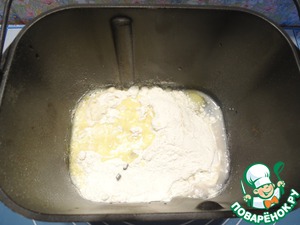 Я замешиваю тесто в хлебопечке. Если у Вас нет ее, ничего страшного - тесто можно замесить руками. Сначала готовим тесто №1 - в теплую воду добавляем дрожжи. Оставляем минут на пять.
