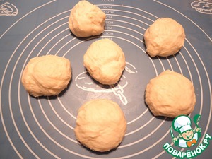 Затем тесто уминаем и делим на 6 равных частей. Накрываем пленкой, чтобы тесто не засохло, оставляем минут на 15.