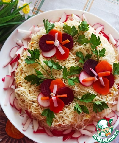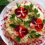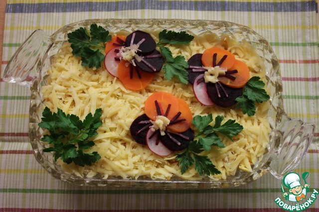 Украшаем салат выкладывая лепесточки из вареных овощей и редиса и листочков петрушки
