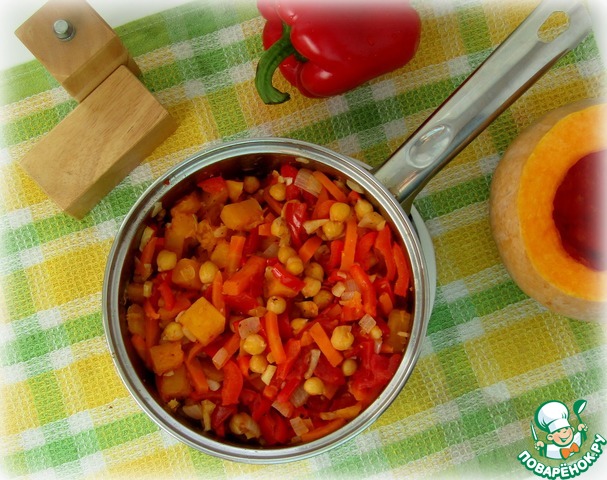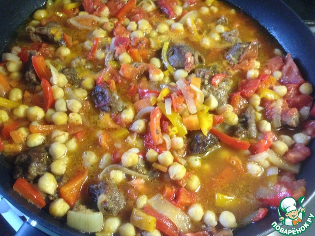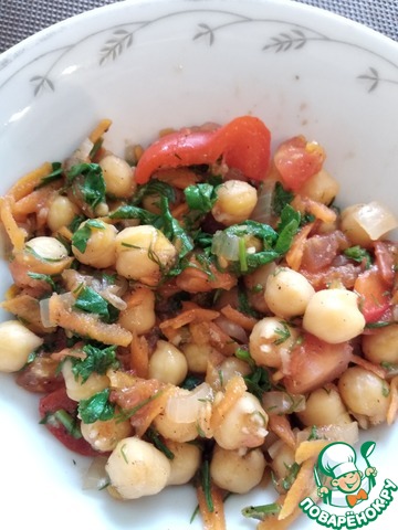 В готовые овощи добавляем отваренный нут, солим, перчим, добавляем хмели-сунели и тушим все вместе еще минут 5, добавляем мелко нарезанную зелень