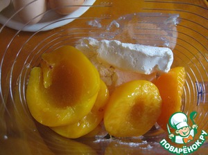 Ровно половину персиков откладываем в чашу, добавляем творог и взбиваем блендером.