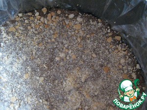 Форму с диаметром 18 см застелить пищевой пленкой. Выложить на дно основу разровнять. Масса сильно липнет к рукам-эту проблему полностью решает 1 ст. л. измельченного печенья. Просто насыпать сверху и по нему разравнивать рукой.