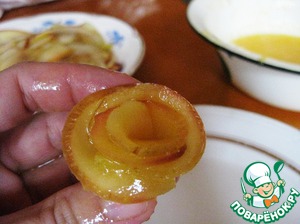 Достаем шумовкой, чтобы стек сироп. И выкладываем на тарелку остыть. И так делаем со всеми ломтиками. Вместе нельзя, чтобы они не поломались.