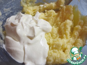 Для этого следует растереть размягчённое сливочное масло и 0,5 стакана сахара. Добавить полстакана сметаны и соду - перемешать. -