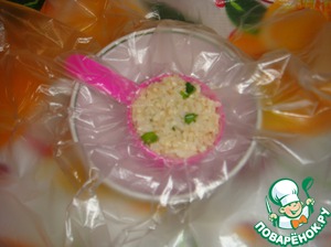 Слегка сбрызнуть пленку водой и наполнить ОЧЕНЬ ПЛОТНО рисом.