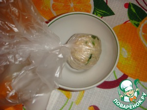 Теперь собрать пленку в пучок, будто хотим завязать хвостик, и скрутить так, чтобы внутри не осталось воздуха. Другой рукой тем временем придать рисовой массе форму шарика. Это только на словах замудрено, поверьте, на деле все очень просто.