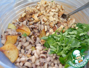 Орехи мелко рубим. Петрушку моем и нарезаем. К картофелю выкладываем фасоль в соусе. Добавляем порубленные орехи и петрушку. Все хорошо перемешиваем.