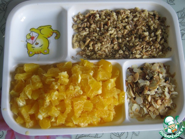 • Очищаем апельсины от кожуры, нарезаем кубиками, грецкие орехи и миндальную стружку обжариваем слегка