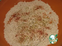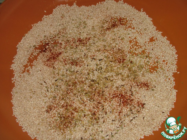 Кунжут прокалить на горячей сковороде без масла 1-2 минуты до золотистого цвета со специями: по щепотке зиры (кумина), кориандра, паприки, чабер, майоран, тмин, орегано (душица). |