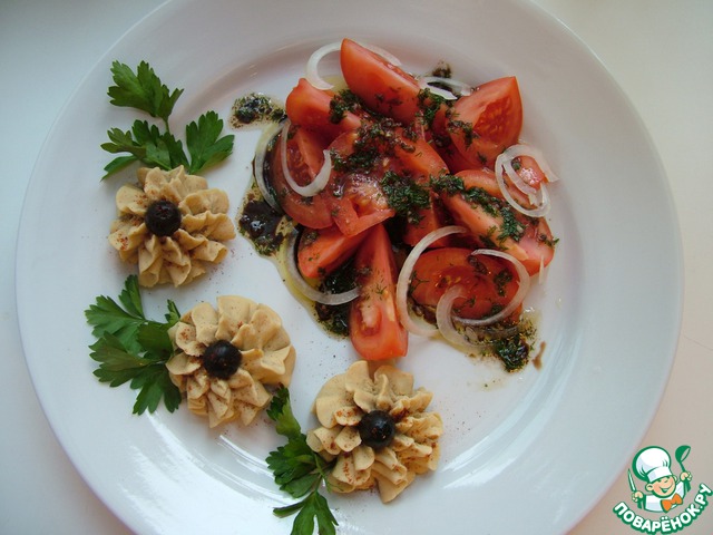 Нарежьте помидор, уложите его на блюдо, от души залейте заправкой. Выложите хумус, используя кондитерский мешок. Украсьте луком, оливками и паприкой. Приятного аппетита! ))) |