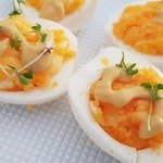 Хочу предложить вариант формы фаршированных яиц. У меня, правда, мало фото, так как пришел голодный муж и все пришлось делать ооочень быстро, но суть, кажется, понятна.
