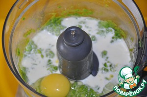 В блендере смешиваем горошек, 1 ложку масла, мяту, яйцо, половину сливок и соль.