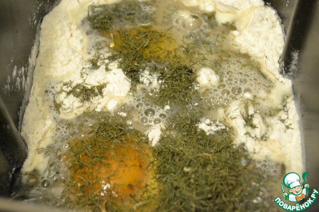 Из муки, дрожжей, 3 яиц, соли, сахара, укропа и воды замесить тесто. Я доверила это дело своей помошнице - хлебопечке.