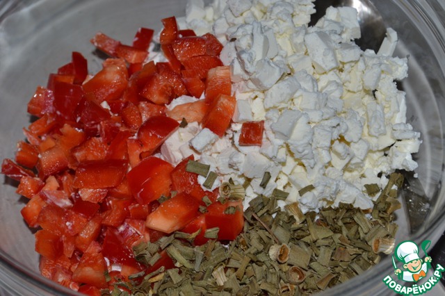 Пока подходит тесто, делаем начинку: режем кубиками перец, брынзу, добавляем зеленый лук. При необходимости досаливаем и перчим. У меня брынза была пресноватая, поэтому я хорошо посолила. Перемешиваем и убираем в сторонку.
