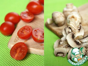 Помидоры и грибы помыть, помидоры разрезать на 2 части, грибы пластинками.