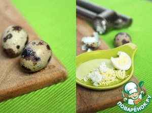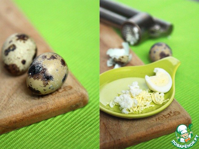 Перепелиные яйца предварительно отварить и пропустить через чеснокодавку (или натереть на мелкой терке).