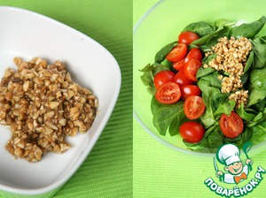 К шпинату, помидорам и орехам добавить яйца, соль, еще немного оливкового масла, перемешать и выложить салат на грибы.