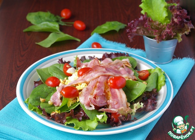 Бекон обжарить и уложить сверху на салат.
