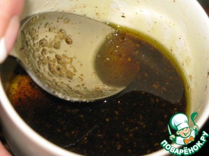 Сделать заправку, смешав оливковое и арахисовое масло, уксус и лимонный сок, сахар, корицу, перец и соль.